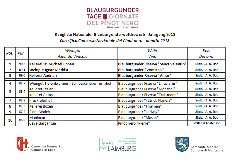 Proclamati i vincitori dei TOP10 del Concorso nazionale del Pinot Nero: la classifica conferma l’alto potenziale di alcune zone altoatesine e dimostra che ogni Pinot Nero di qualità può avere qui la sua occasione di successo.